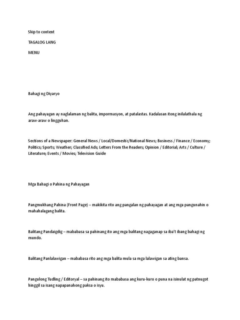 Mga Bahagi o Pahina ng Pahayagan. Mga Bahagi o Pahina ng Pahayagan Pangmukhang Pahina makikita rito ang pangalan ng pahayagan at ang mga pangunahin o mahahalagang balita. Sanaysay tungkol sa magulang tagalog ni Marie Antonette D.