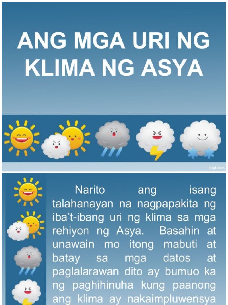 Sa madaling salita nabigyang puwang ang Panitikang Tagalog sa panahong ito. MGA URI NG KLIMA SA MUNDO PAULENE G. Ang mga katangian ng bawat zone ng klima ay nag-iiba ayon sa mga tampok ng lupain kung saan naroon ang klima na ito.