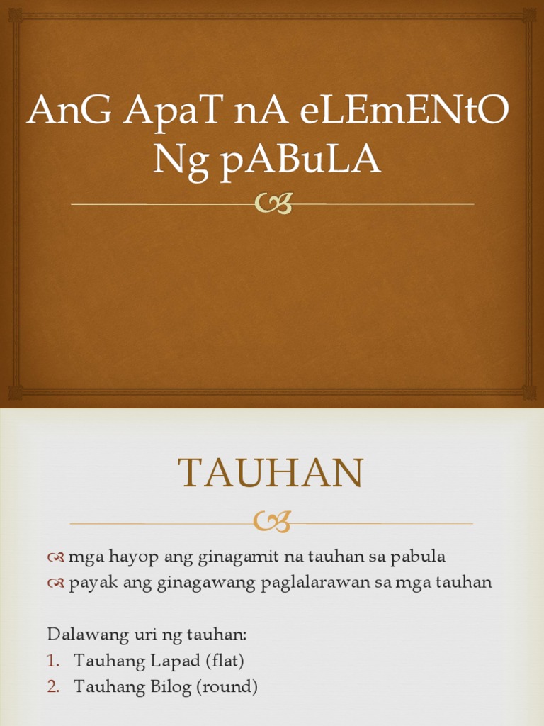Tauhan ang mga kumikilos at nagbibigay-buhay sa dula. Mayroon tayong dalawang uri ng tauhan. Ano ang mga Elemento ng Pabula.